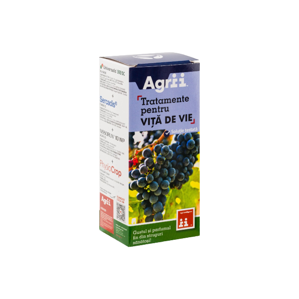 AGRII PACK TRATAMENT VITA DE VIE, pachet complet si gata de utilizare pentru vita de vie. Pachetul contine 4 produse specializate ce asigura un start sanatos si protectie impotriva principalelor boli care pot aparea la vita de vie, precum fainarea, mana, putregaiul, dar si impotriva principalilor daunatori ce pot afecta calitatea strugurilor, cum ar fi paianjenul rosu comun.