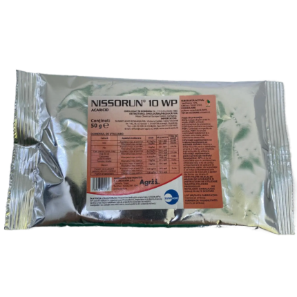 - Acaricidul NISSORUN 10 WP ambalat la 50 g se aplica intr-o cantitate de apa de 100 L.